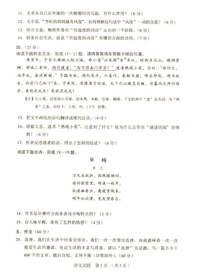 2011年全国成人高考高起点《语文》试题及答案