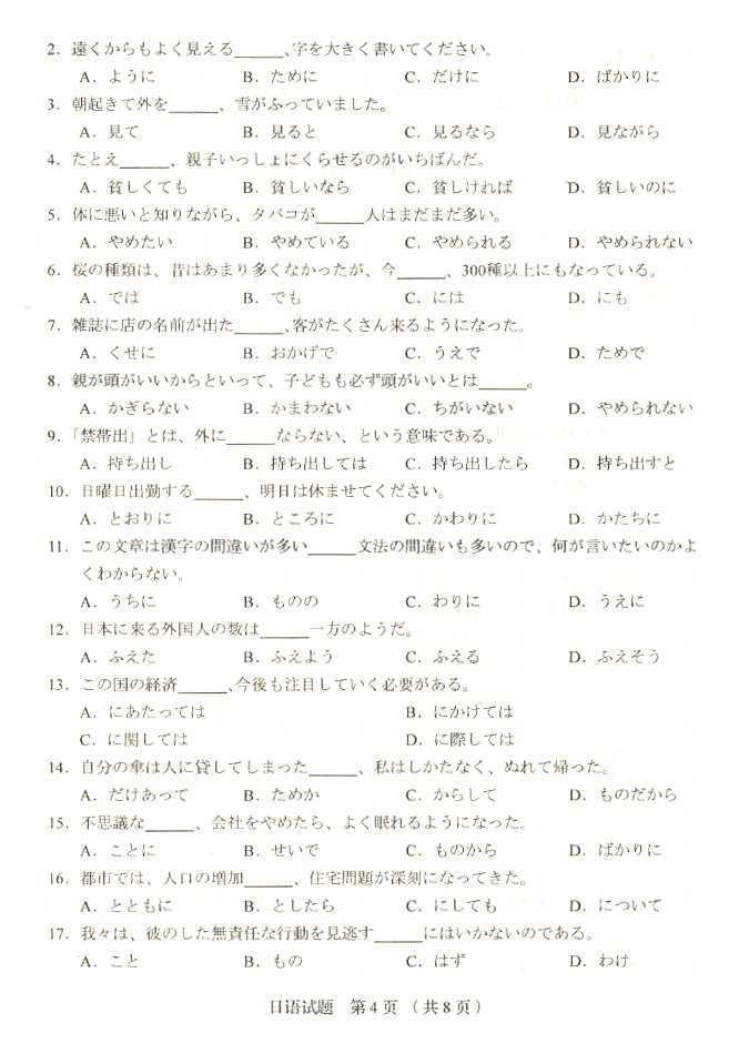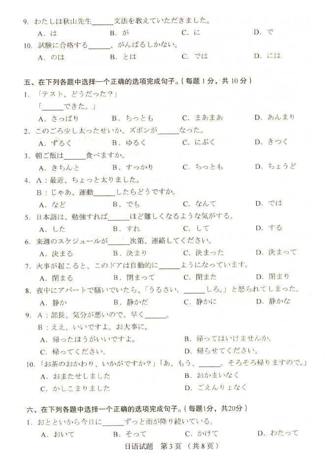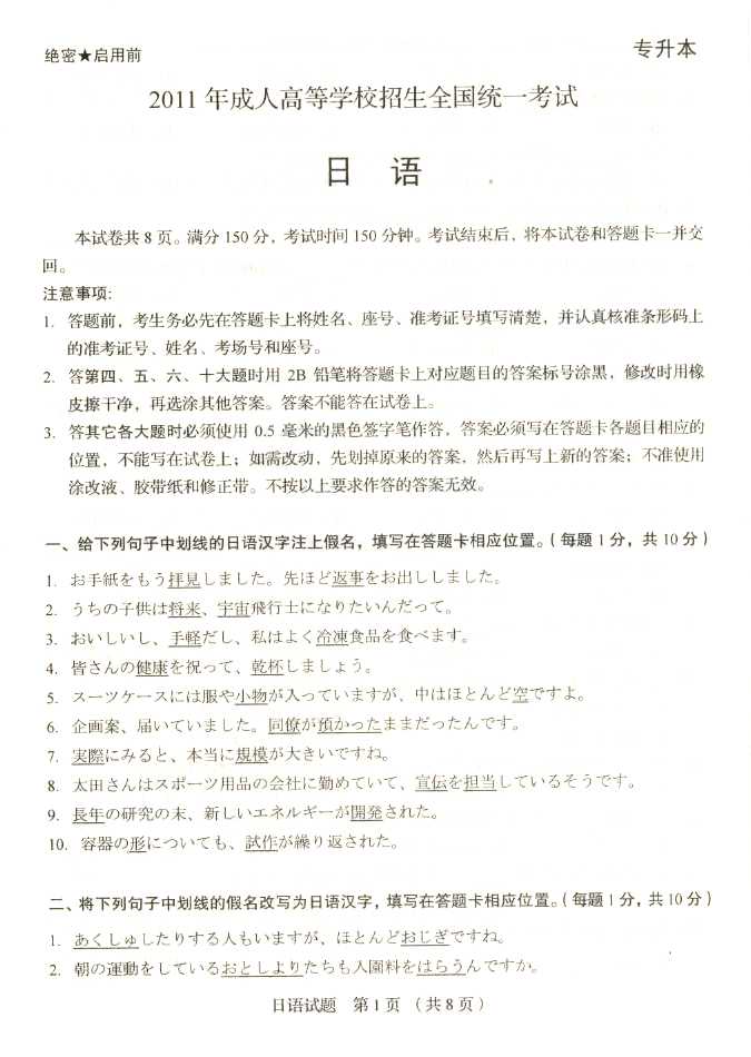 2011年全国成人高考专升本《日语》试题及答案