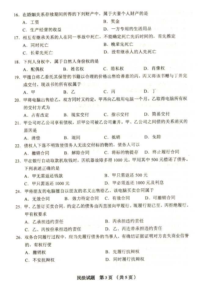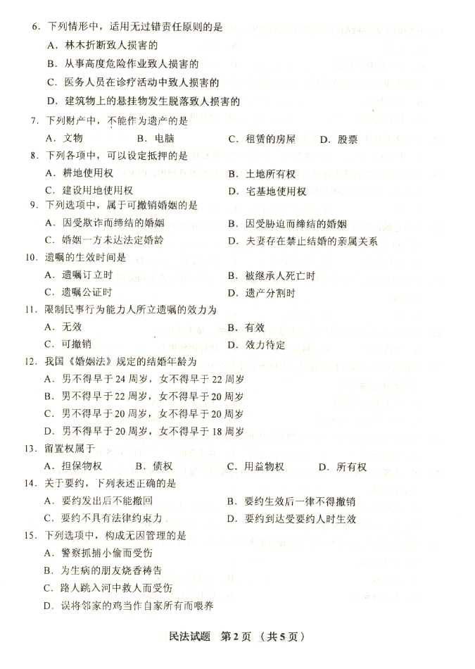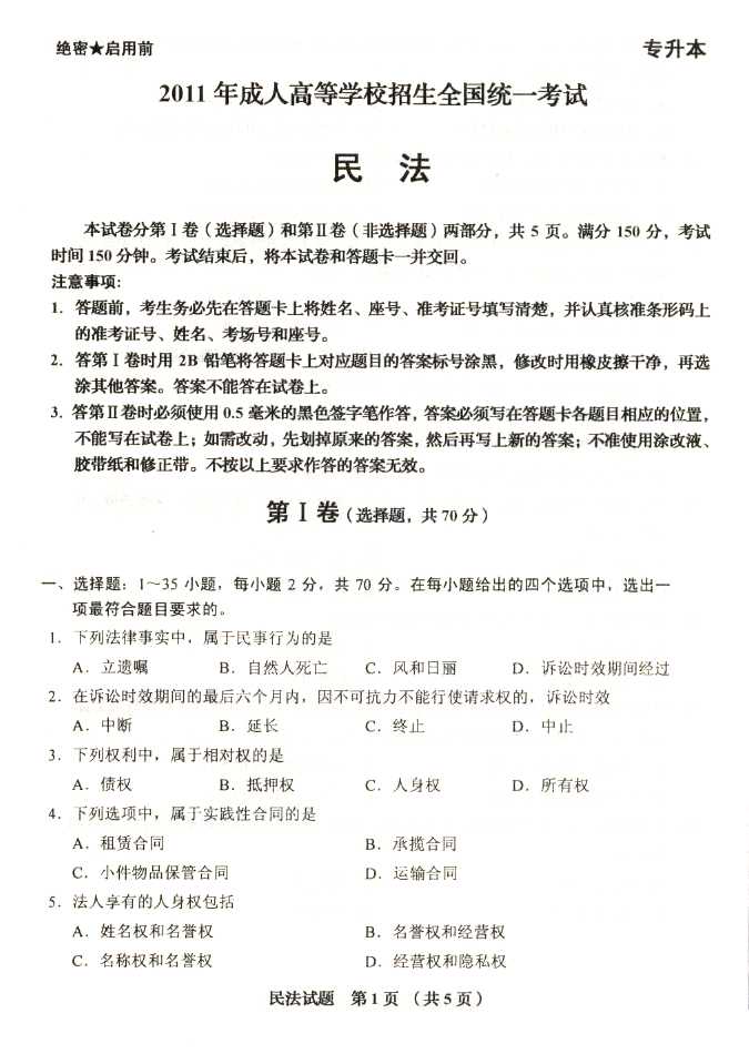 2011年全国成人高考专升本《民法》试题及答案