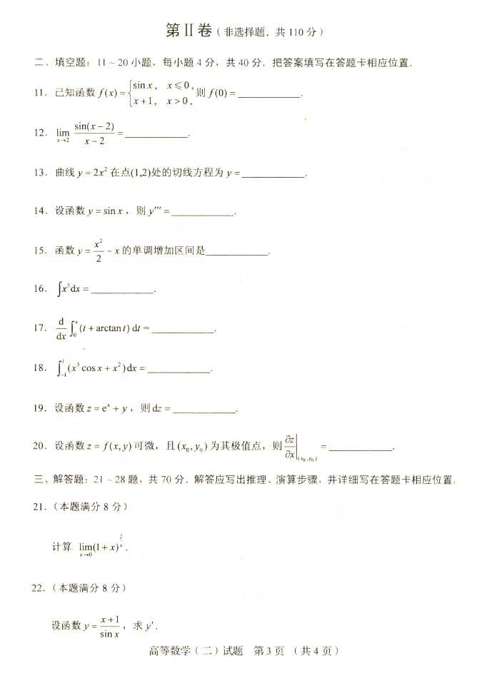2011年全国成人高考专升本《高等数学(二)》试题及答案