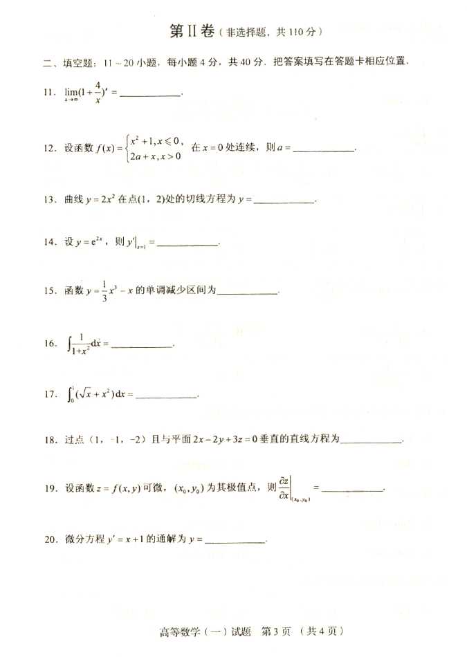 2011年全国成人高考专升本《高等数学(二)》试题及答案