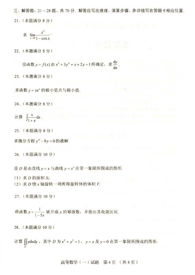 2011年全国成人高考专升本《高等数学(一)》试题及答案