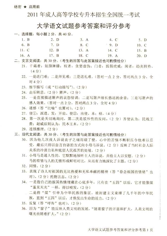 2011年全国成人高考专升本《高等数学(一)》试题及答案