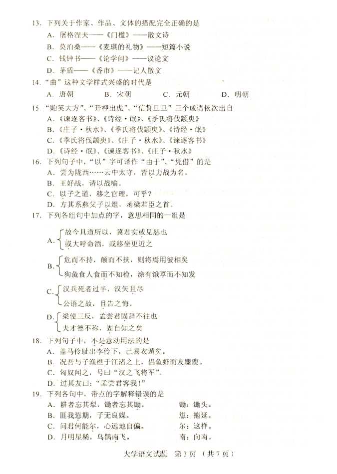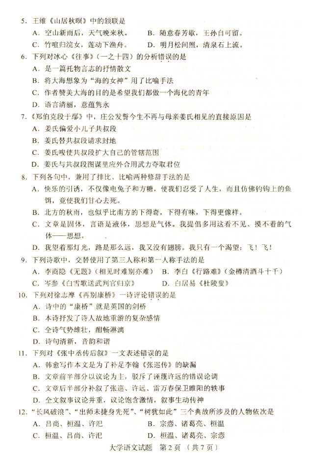 2011年全国成人高考专升本《大学语文》试题及答案