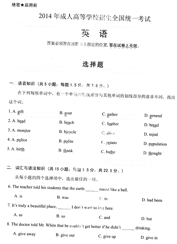 2014年成人高考高中起点《数学》(文史)真题及答案
